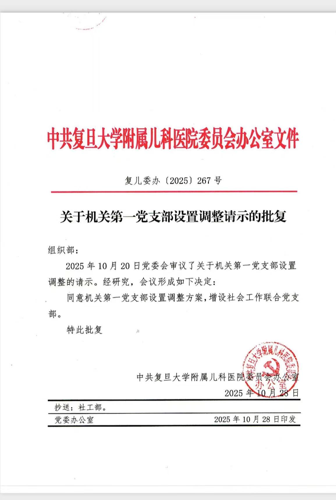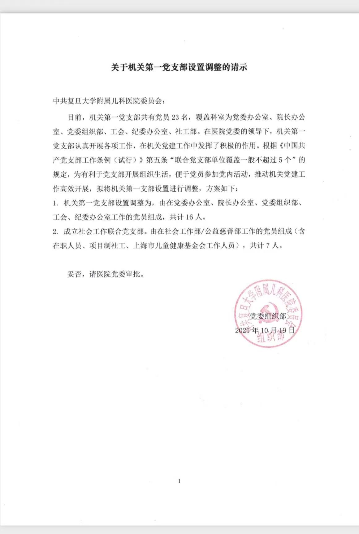 关于机关第一党支部设置调整